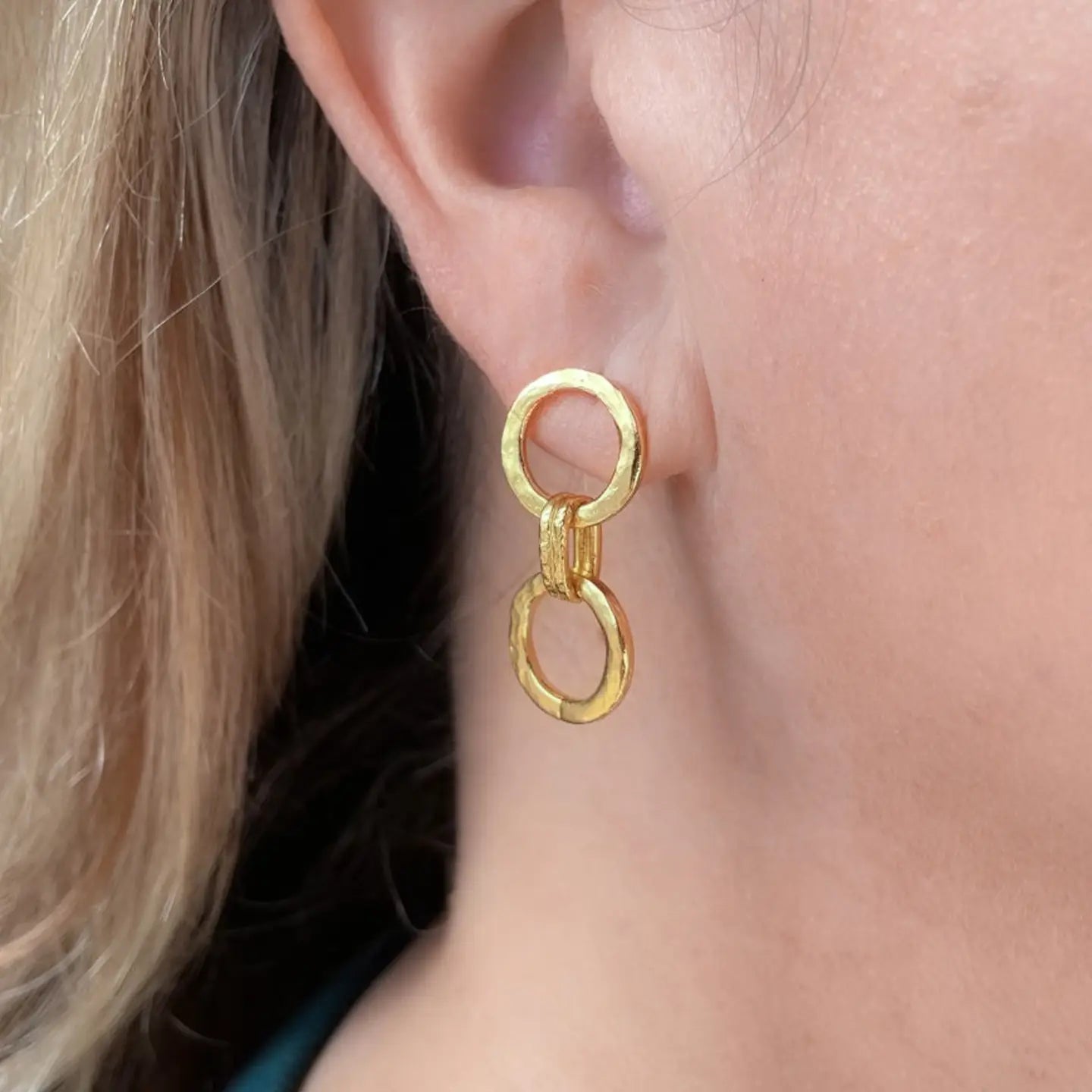 They are made of brass and coated with 22-karat gold. The length is 1.25 inches, and they are designed with posts for easy wear.