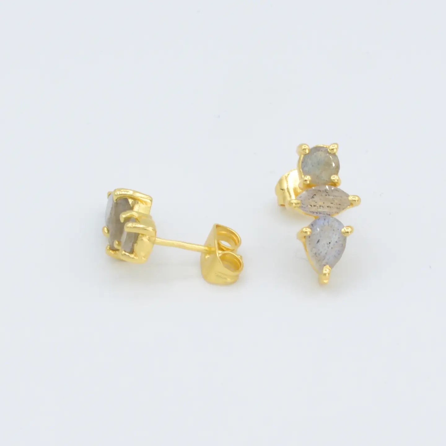 Delicate and lightweight, these triple labradorite studs feature three glowing stones set in 14kt gold-plated brass. Just 1/16" long, they're the perfect hint of shimmer for everyday wear.
