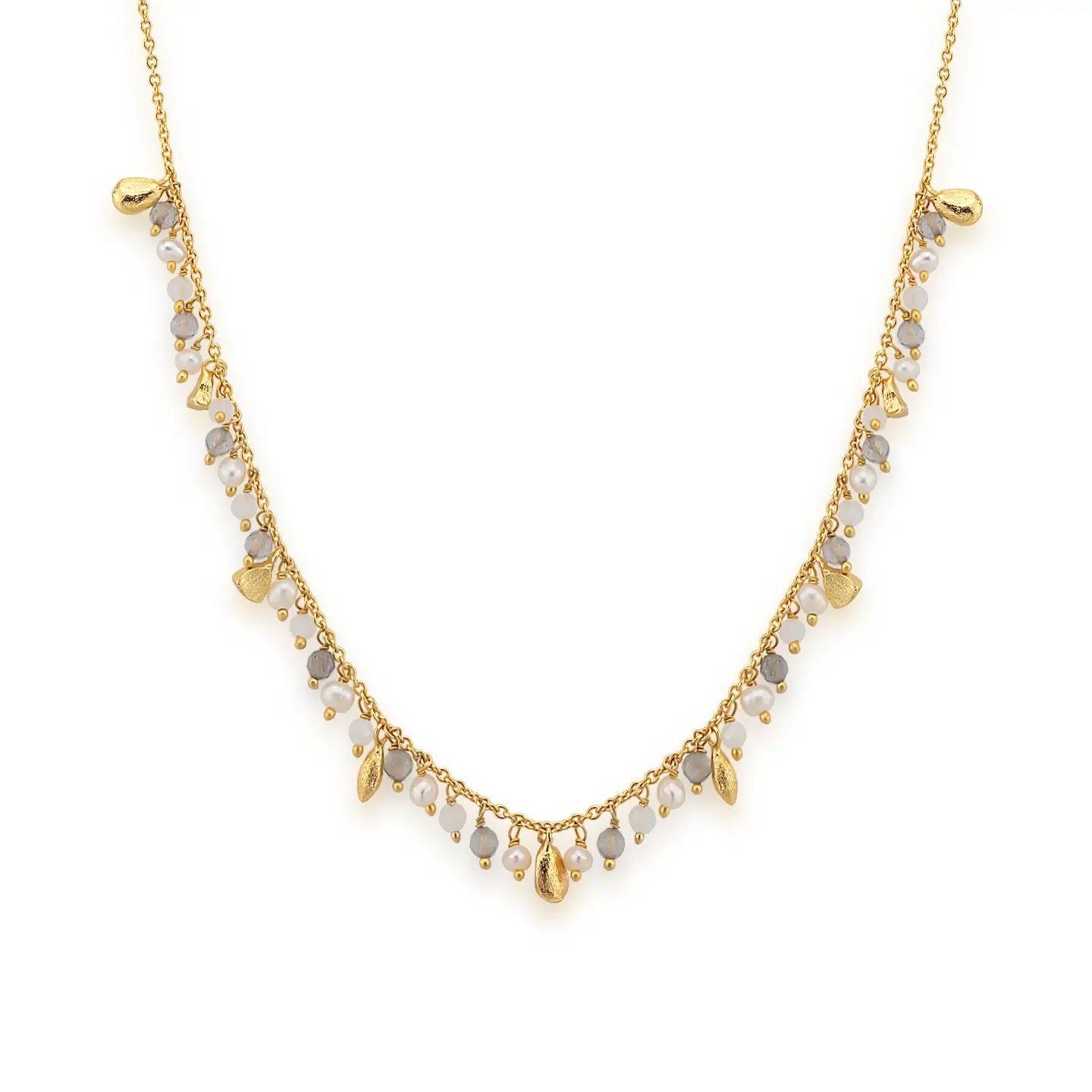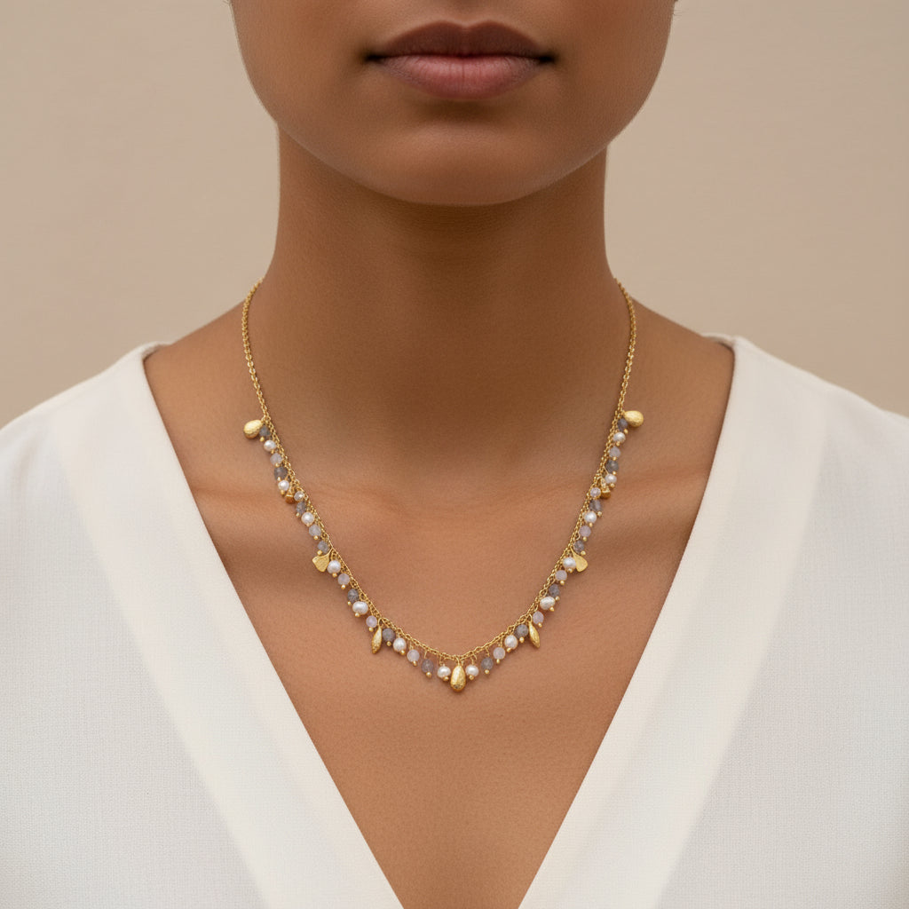 Introducing our pretty and feminine necklace, adorned with hand-wire-wrapped freshwater pearls, moonstone, and Labradorite faceted stones. This stunning piece features an 18kt gold-plated adjustable chain, allowing you to wear it at 16", 17", or 18" for the perfect fit. The neutral tones of the gemstones make this necklace a versatile and elegant addition to any outfit, sure to become your favorite go-to accessory.