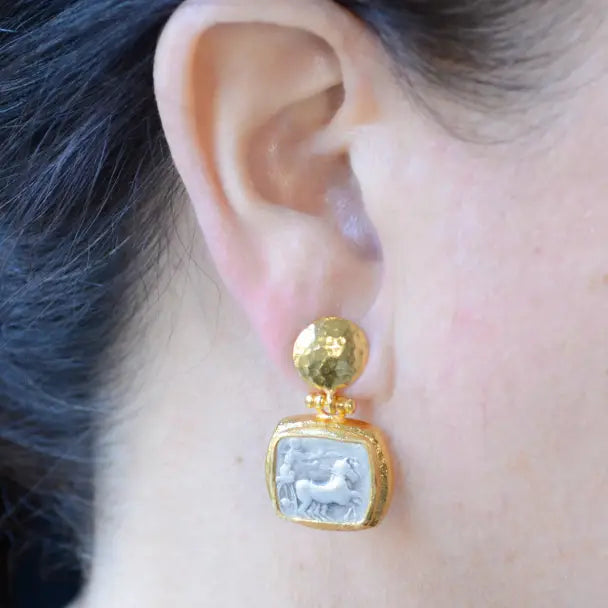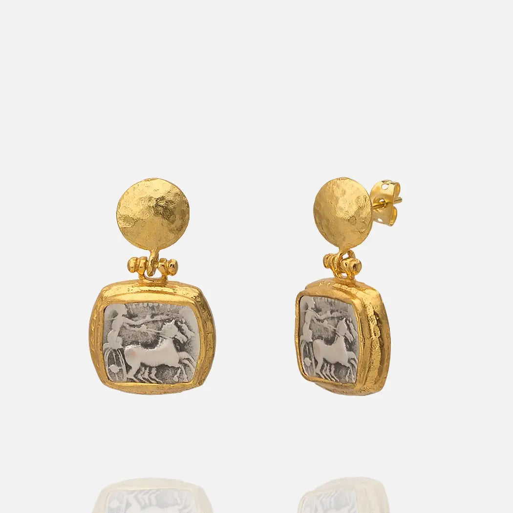 Reproduction Roman chariot coin earring with post, 22kt gold, and rhodium-plated brass.